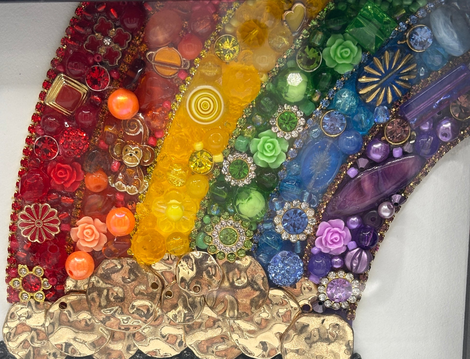 Celebrate St. Patrick's Day with this charming 8.75 x 8.75 inch shadow box frame featuring a whimsical pot of gold nestled at the end of a vibrant rainbow. A four-leaf clover crowns the treasure, adorned with shimmering green frosted sea glass that catches the light beautifully. Hunt for hidden details throughout the piece, such as the playful monkey charm tucked among the rainbow hues. "Luck of the Irish" is the perfect accent for any space that celebrates imagination and joy. The art work can be hung or placed in a stand.